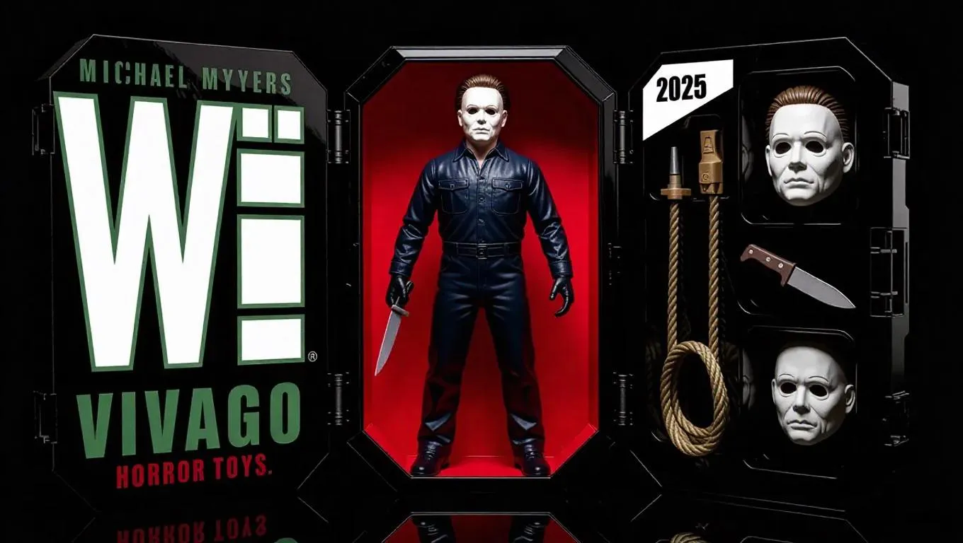 Premium collectible Michael Myers action figure in a dynamic standing pose, encased in a sleek black blister pack. Features HD photorealistic detailing, exclusive accessories (knife, mask, rope), and bold "VIVAGO Horror Toys 2025" branding. Ideal for horror enthusiasts seeking high-end, limited-edition memorabilia with professional-grade realism and eerie aesthetic appeal.