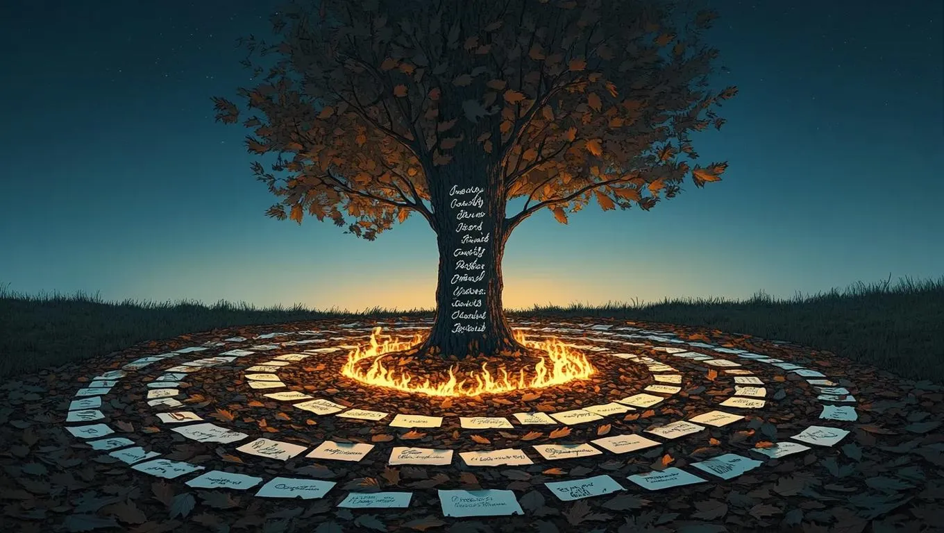 Create symbolic AI-generated art of a solitary tree with etched names, fallen leaves in concentric life rings, and a glowing sapling amid burned photographs. Anime-style watercolor visuals blend midnight-to-dawn gradients, cinematic minimalism, and profound storytelling. Explore AI image generation for ethereal, metaphor-rich scenes with vivago.ai's creative tools.