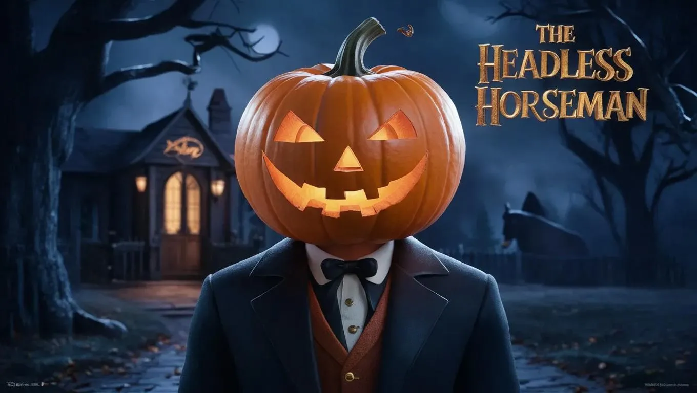 Generate a mesmerizing 3D Disney-style poster featuring a pumpkin-headed character and eerie "The Headless Horseman" text. Vivago.ai transforms prompts into vivid, professional-grade visuals using advanced AI effects, seamless editing tools, and AI-generated artwork for captivating, spooky designs.
