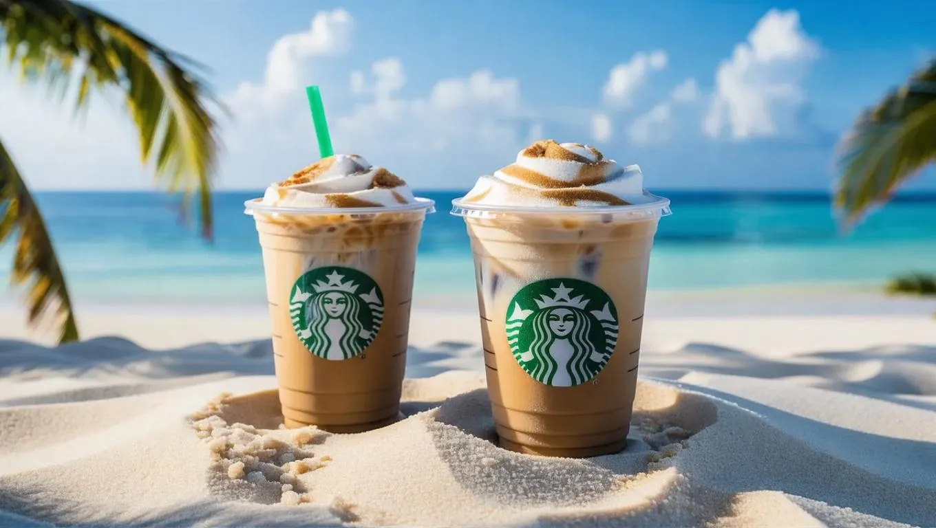 Create a refreshing AI-generated image of an iced coffee cup surrounded by pristine white sands. Perfect for summer-themed visuals, this prompt blends cool beverages with desert serenity. Ideal for social media, ads, or travel content. Transform text into striking visuals effortlessly using VivaGo.ai's advanced AI tools for professional-grade results.
