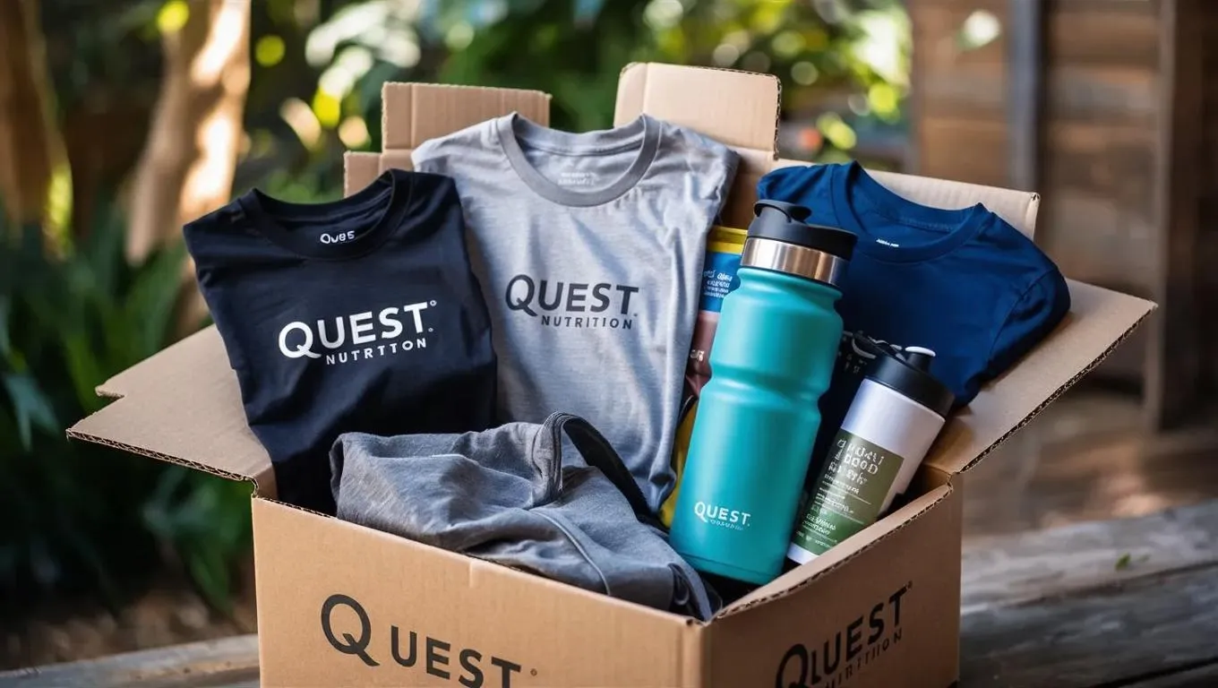 Generate AI-powered visuals of Quest Nutrition merchandise in branded packaging. Showcase a shipping box with labeled Quest Nutrition water bottles, t-shirts, and accessories using AI image generation. Create vibrant, branded promotional visuals for marketing campaigns or product launches, blending realism with creative design for engaging branded content.