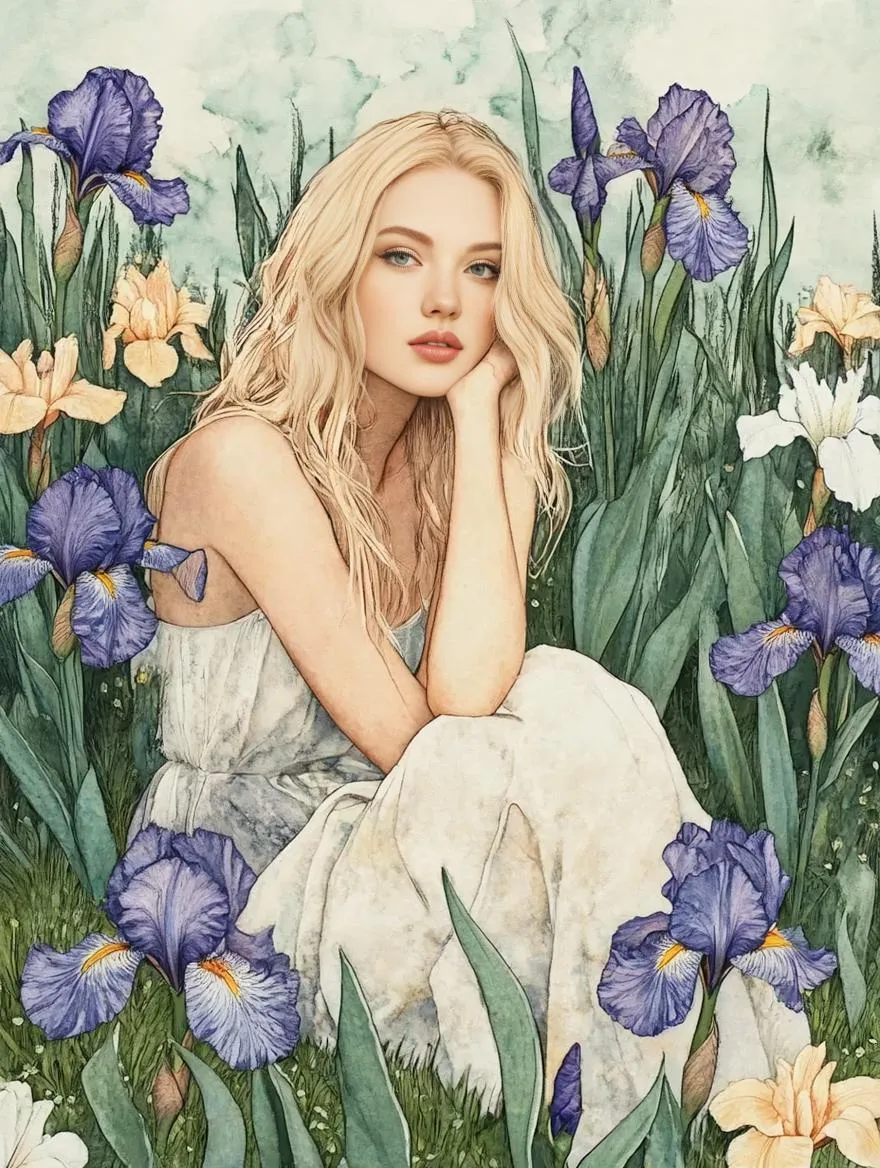 Create a stunning AI-generated watercolor and ink illustration of a blonde woman surrounded by blooming irises, lilies, and tulips. Featuring intricate textures, soft lighting, and ArtStation-quality details, this vivago.ai design transforms prompts into professional-grade digital art with trending aesthetic appeal.