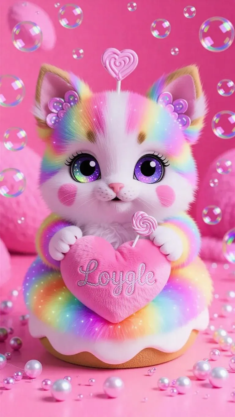 A SnuggleBud, egg-sized with baby-animal proportions, giant sparkling eyes (30% bigger!) filled with pastel glitter galaxies forming heart-shaped pupils on eye contact. Rosy cheeks blush holographic pink when touched, ultra-fluffy fur shimmers with rainbow strands and heat-reactive patches forming glowing cartoon hearts that pulse when hugged. Mini paws with embroidered toe beans softly “mew-mew” when pressed. Floppy ears bloom LED cherry blossoms at laughter. Tiny wagging tail holds a heart-shaped lollipop releasing vanilla-scented bubbles. When idle, curls into a fuzzy donut with a mini pillow and blanket, whispering lullabies. Hyper-detailed textures, candy-colored dreamcore, vaporwave lighting, floating holographic cookies, teacup-sized adoption certificate stamped with a pawprint, sleeping on human palm.