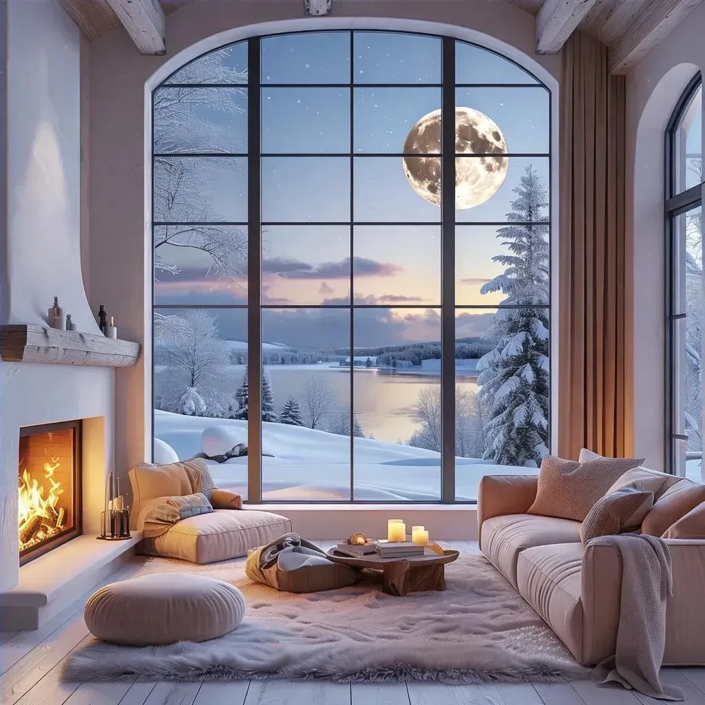 Create a cozy AI-generated December scene: Pastel-colored living room with crackling fireplace framing a serene winter landscape under a full moon. Explore Vivago.ai's art tools for dreamy seasonal visuals, AI effects, and effortless fireplace-to-moonlight ambiance transformations. Perfect for winter-themed digital art and atmospheric creations.