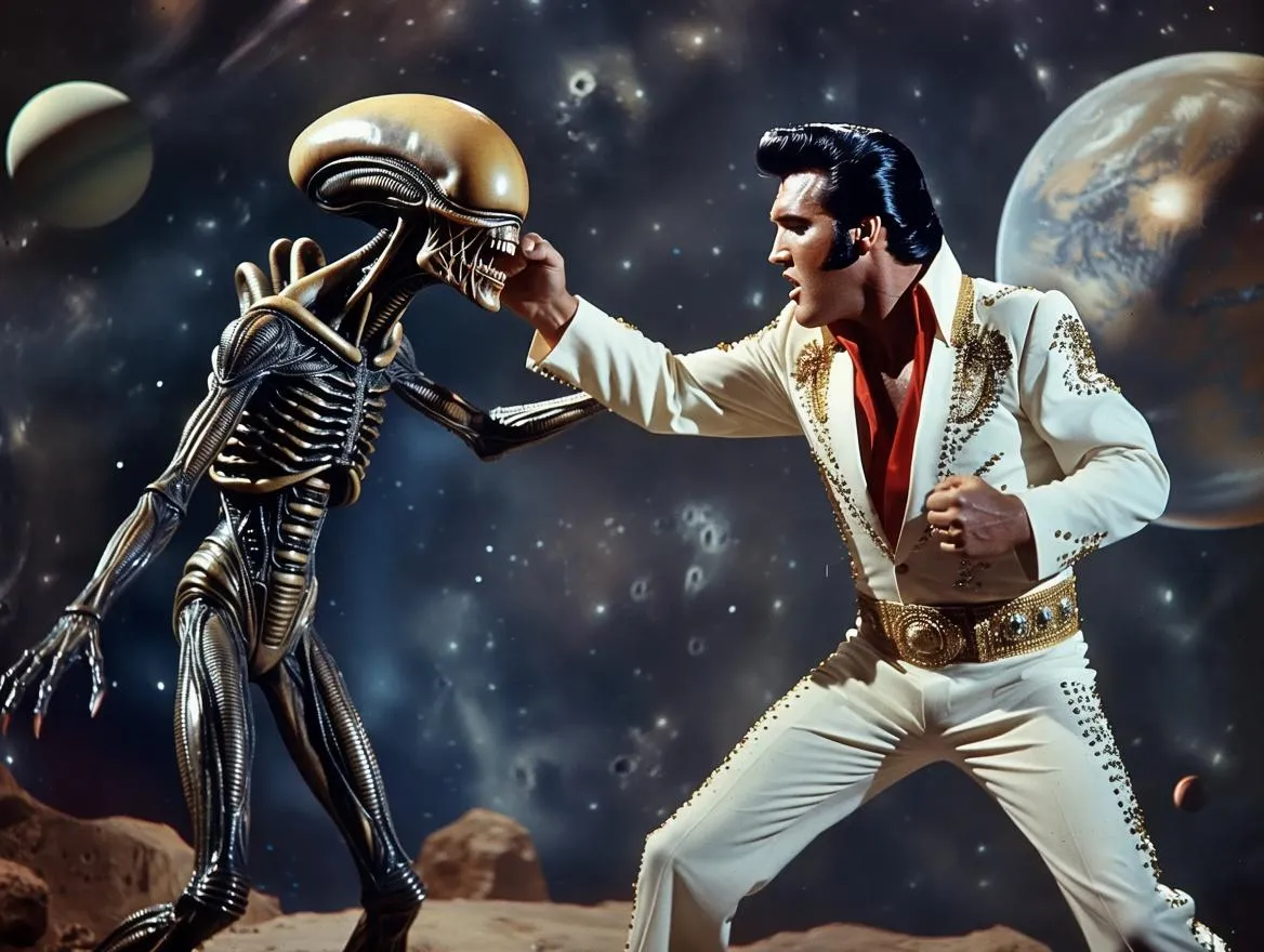 Create dynamic AI-generated visuals of Elvis Presley in an intergalactic battle. Vivago.ai transforms text prompts into striking sci-fi artwork, blending retro charm with cosmic action. Perfect for unique space-themed designs, alien combat scenes, and vintage futurism. Try AI effects for professional-grade results.