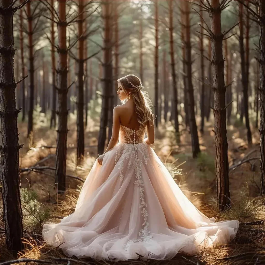 Create ethereal AI-generated bridal imagery in a mystical pine forest setting. Craft romantic woodland photoshoots with flowing pink tulle gowns, dappled sunlight, and cinematic shallow depth of field. Perfect for fairytale-inspired wedding visuals featuring braided hairstyles, delicate jewelry, and enchanted forest backdrops with dreamy color palettes. Elevate nature-themed weddings with AI-enhanced ethereal atmosphere and professional-grade cinematic lighting effects.