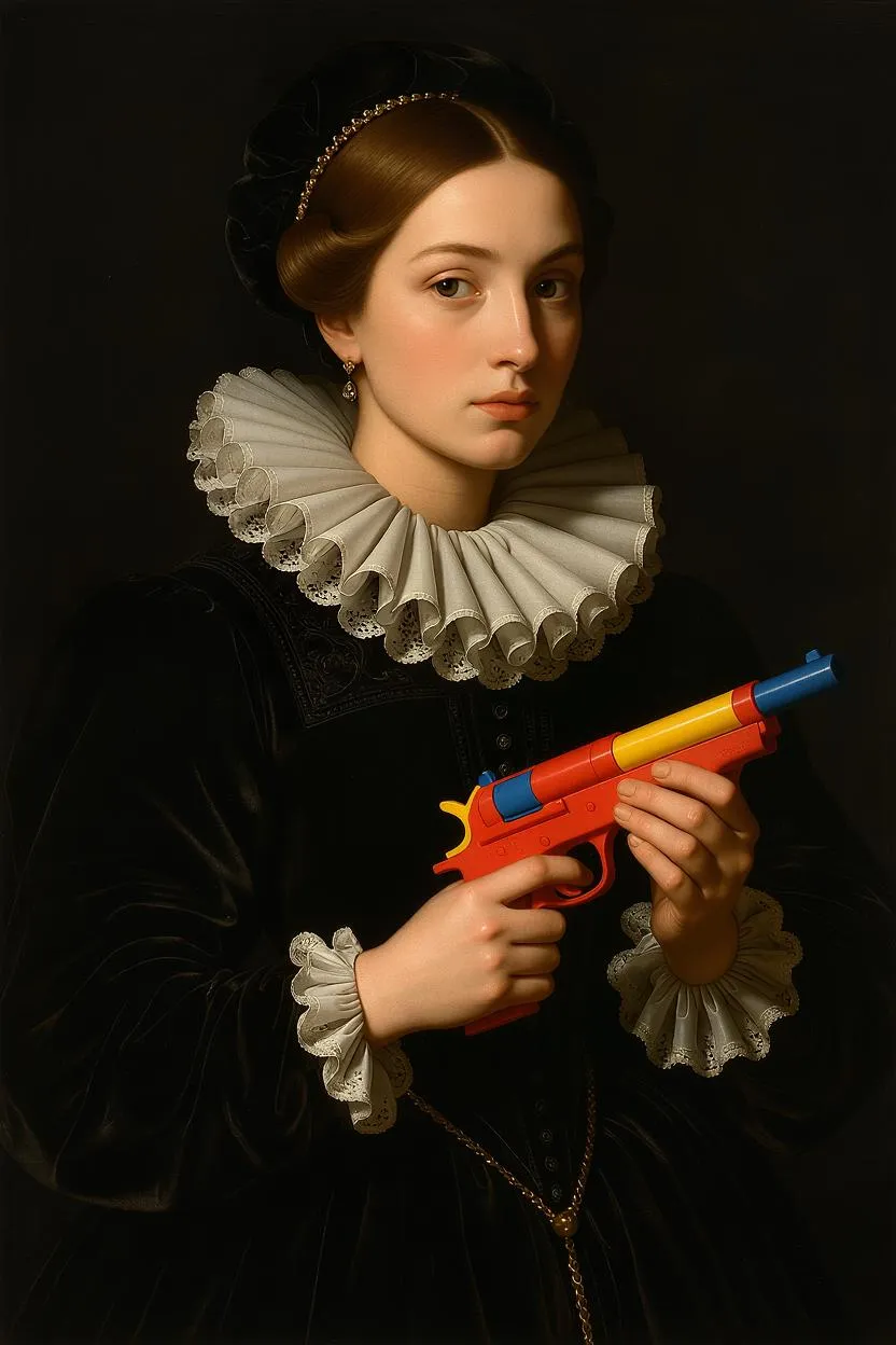 AI-generated Renaissance portrait merges classical elegance with surreal modern absurdity. Hyper-realistic chiaroscuro lighting highlights intricate Elizabethan ruff and plastic toy gun contrast. Stark black background intensifies regal solemnity while golden-yellow muted tones evoke aged painterly textures. Explore AI-powered historical fusion art blending poetic contradiction and anachronistic visual tension for striking creative results.