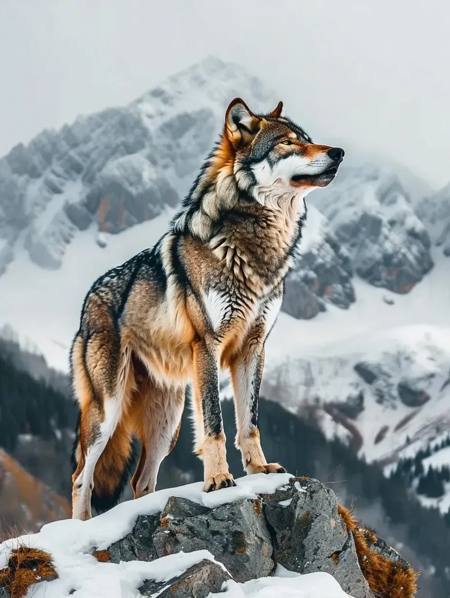 Generate a striking AI image of Garcia Wolf exuding power, standing majestically on a mountain with a clean white contour background. Perfect for realistic animal art, strength-themed visuals, and nature-inspired designs using advanced AI tools for professional-grade results. Ideal for posters, branding, or digital content.
