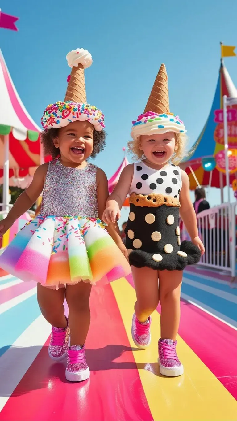 Watch adorable toddlers as birthday cake ice cream and cookies & cream cone strut a whimsical carnival runway. AI-generated art features sparkly sneakers, confetti sprinkles, and cheerful carnival music.