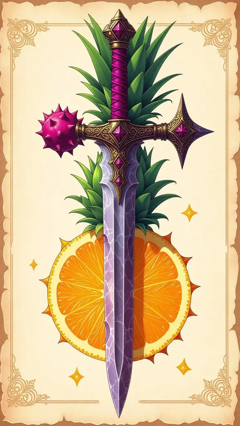 Create magical fantasy illustrations of medieval weapons fused with fruits like dragon fruit swords, pineapple morning stars, and orange shields. Featuring glowing effects, parchment backgrounds, and vector-style art. Generate professional AI visuals with Vivago.ai.
