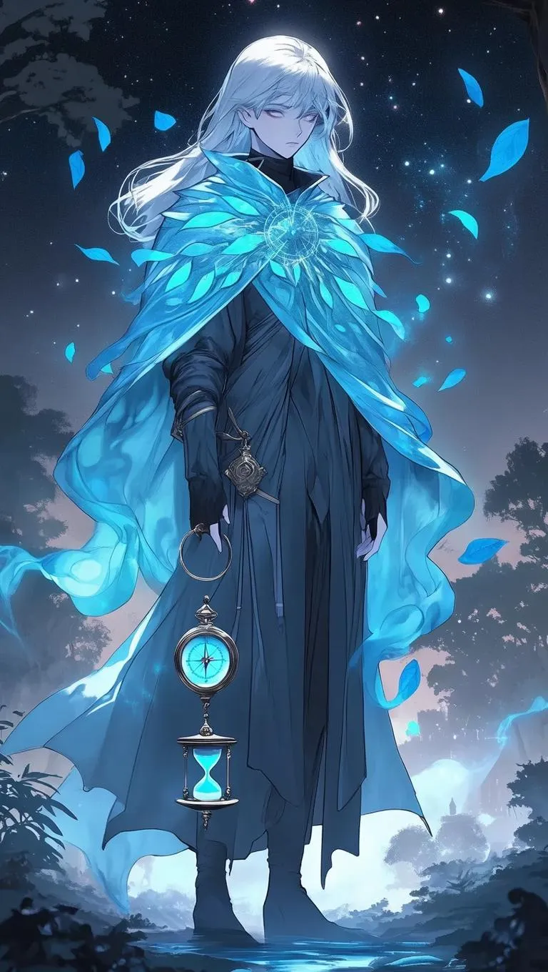 Generate surreal anime-style AI art of an ethereal figure with flowing silver-blue hair and morphing cloak patterns. Vivago.ai transforms text prompts into mystical visuals featuring glowing blue leaves, floating compasses, and shifting forest-city landscapes. Create dreamlike digital art with symbolic watercolor effects and professional AI tools for surreal character design and dynamic backgrounds.