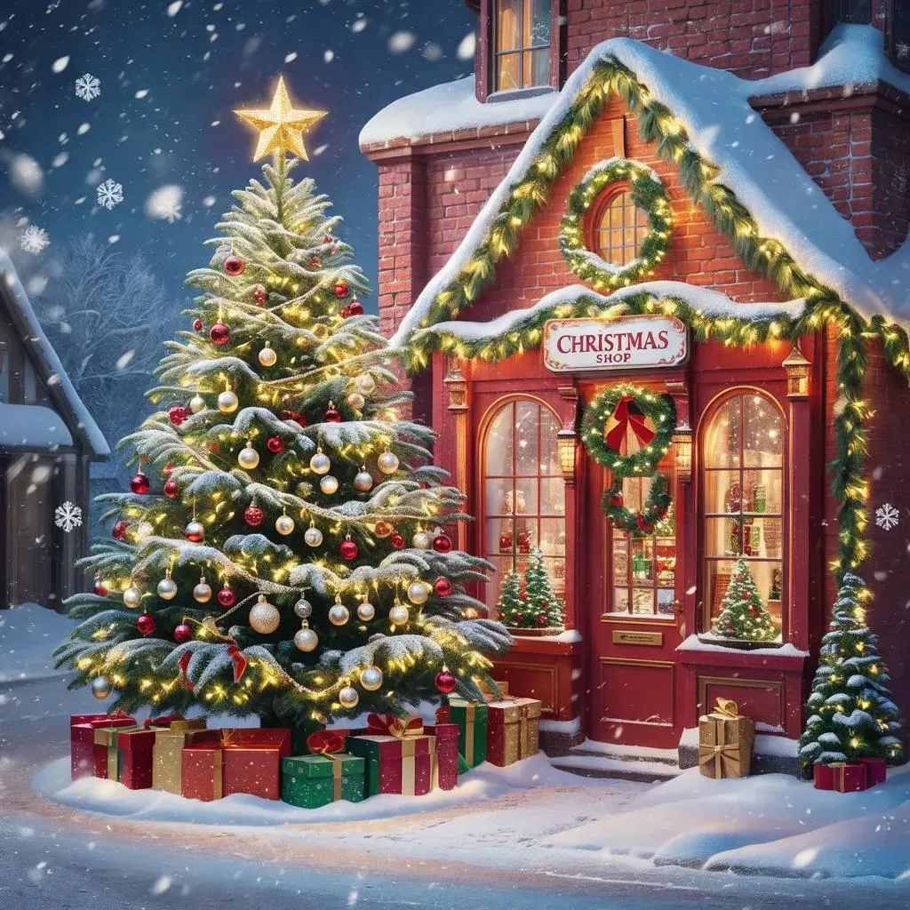 Create a vibrant AI-generated painting of a festive Christmas tree beside a charming holiday shop. Capture the magical holiday spirit with vivid artwork, perfect for seasonal greetings or decor. Transform your ideas into stunning visuals using VivaGo.ai's text-to-image AI tools.