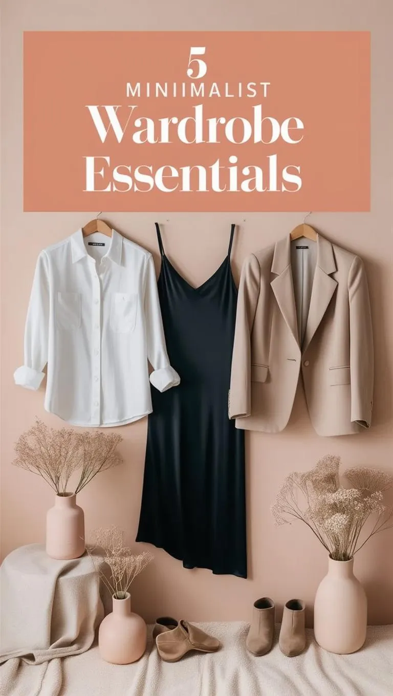 Discover the 5 minimalist wardrobe essentials in a warm, soft aesthetic. Styled scene features crisp white button-ups, black slip dresses, and neutral blazers with blush, beige, and cream tones. Soft lighting, dried florals, and elegant "5 Minimalist Essentials" text in peach serif font create Pinterest-worthy inspiration for timeless, curated fashion. Perfect for clean, cozy visual storytelling.