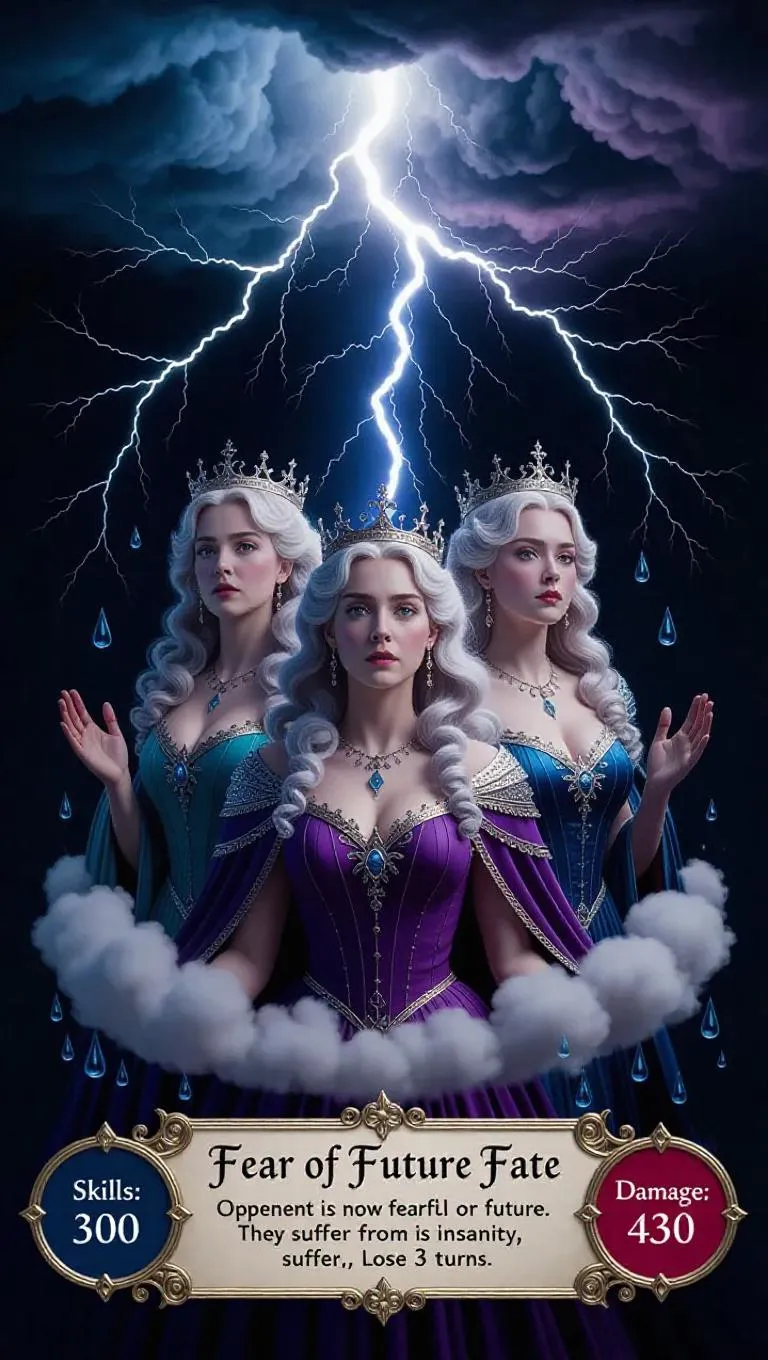 A majestic fantasy electric lightning storm conjures old and young versions of the same queen, adorned on a 3D dimensional game card. The card features a rectangle at the bottom with elegant fantasy text reading "Fear of Future Fate". Below, a description states "Opponent is now fearful of the future. They suffer from insanity, lose 3 turns". Bottom left circle with "Skills: 300". Bottom right circle with "Damage: 430". Ethereal clouds, shimmering tears turning into raindrops, intricate details, glowing aura, royal regalia, mystical realm backdrop, celestial heavens, divine light, swirling mist.