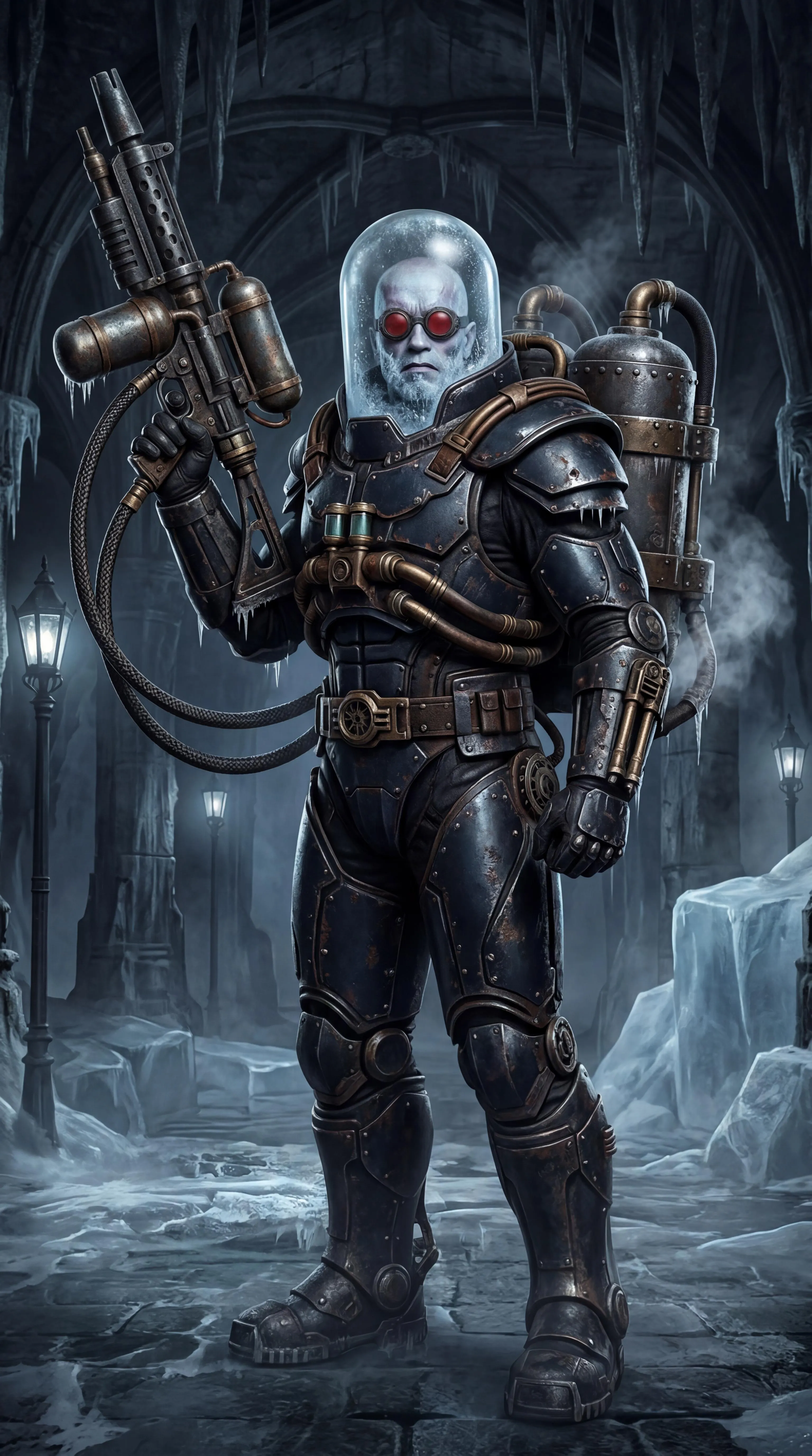 The art style from how Mister Freeze appears in the comics are translated into the realistic aesthetic of Arnold Schwarzenegger's live-action portrayal of Bane (from Batman & Robin), albeit to fit Tim Burton's much darker and more gothic tone for the Batman films instead of Joel Schumacher's much flashier and more flamboyant direction. Batman is not charging at him, nor are there any artist signatures. No sensitive information or guidelines violating content seen or involved.