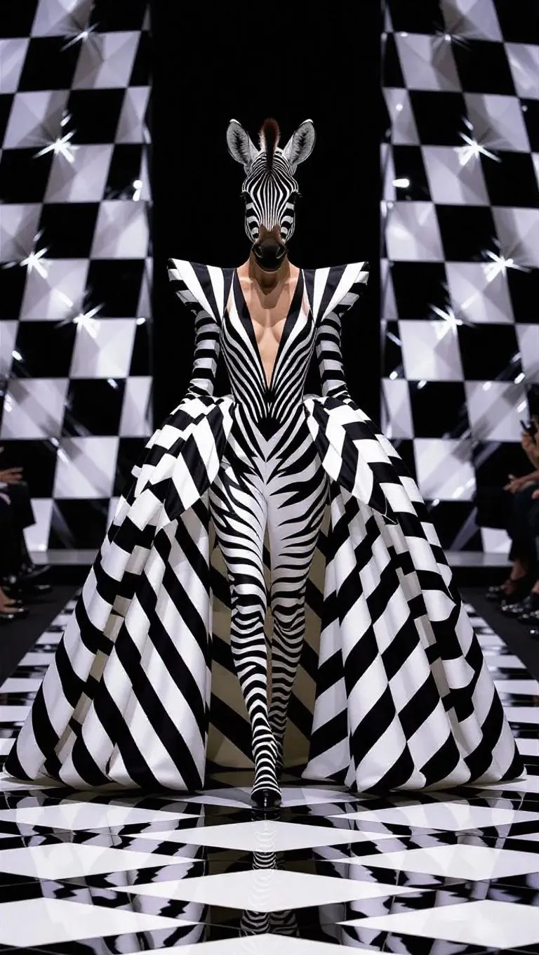 Create a monochrome AI masterpiece with a zebra in a high-fashion geometric gown blending into a black-and-white runway. Explore avant-garde zebra fashion designs, surreal optical illusions, and luxury couture visuals. Perfect for AI-generated animal-inspired avant-garde art, monochrome elegance, and striking runway concepts with vivago.ai's creative tools.