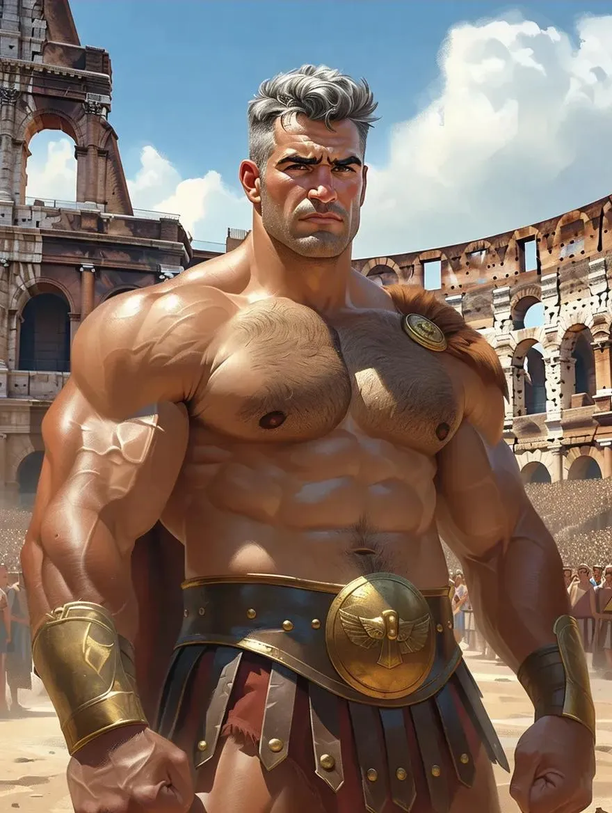 Generate a chubby Roman gladiator AI image with a unique twist: flabby physique, matte black hairy chest, and wise gray hair in the Colosseum. Capture determination in his eyes and the Brownscale backdrop for epic realism. Explore AI creative tools at vivago.ai for professional-grade historical scenes, text-to-image magic, and cinematic effects.