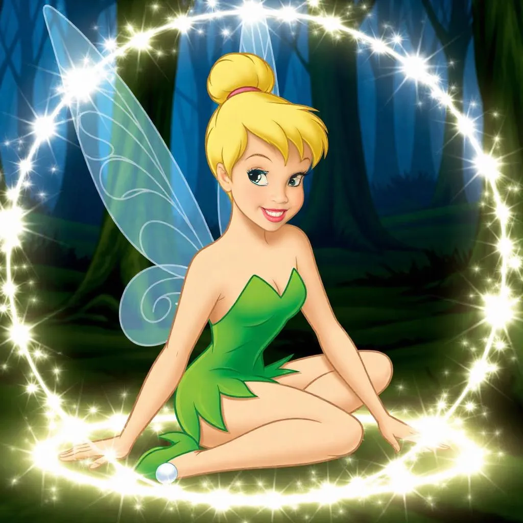 Create a high-definition AI-generated image of Meaghan Martin as TinkerBell from Disney's 1953 "Peter Pan." Featuring a yellow wig with a top bun, green leaf dress, fairy wings, and blue-eyed charm. Perfect for fantasy art, cosplay inspiration, or vintage Disney tributes. Explore vivago.ai's AI tools for professional-grade character design, photo effects, and magical visual storytelling.
