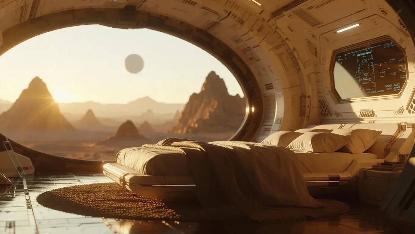 High quality, 8K, Ultra HD, Highly detailed, High contrast, Perfect and Detailed Environment, Perfect Furnitures and Furnishing, Perfect Cinematic close-up photo, sunset. Bionic style space station interior design on the alien planet surface: 1.0 > Beige futuristic high-tech bionic bedroom, SD2.1_2.1realismEngine_v10, Miki Asai Macro photography, close-up, hyper-detailed, sharp focus, studio photo, intricate details, sleek lines, minimalist aesthetic, metallic accents, daylight, reflective surfaces, soft shadows, ambient lighting, warm hues, sci-fi atmosphere.