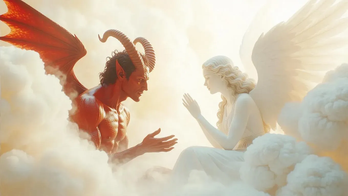 A diabolical devil and a serene angel engage in a cryptic conversation, hovering amidst swirling, iridescent cloud formations that resemble cauliflower blooms, as warm, golden light seeps through the gaps, casting an ethereal glow. The devil's crimson skin glistens with dew, his horns twisting upward like ram's horns, while the angel's porcelain complexion radiates an aura of purity, her wings unfolding like a lotus flower. Soft, feathery cirrus clouds waft by, as if blown by an unseen breeze, in a surreal, high-contrast scene that embodies the essence of a magazine cover, with an airbrushed, hyper-realistic finish, reminiscent of a fantastical dreamscape.