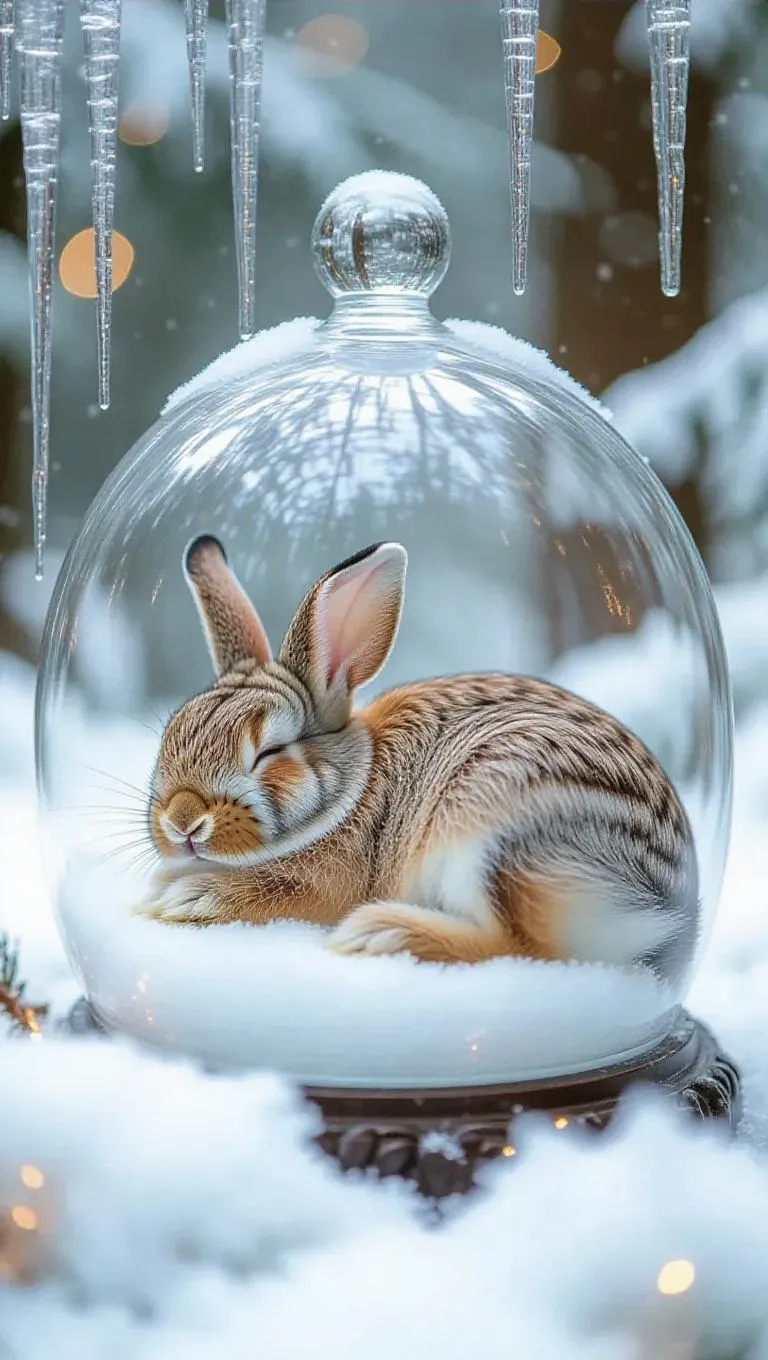 A sleeping rabbit curled inside a translucent crystal dome, surrounded by glistening icicles and soft, fluffy snow, creating a magical, winter wonderland atmosphere in a frost-laden forest.