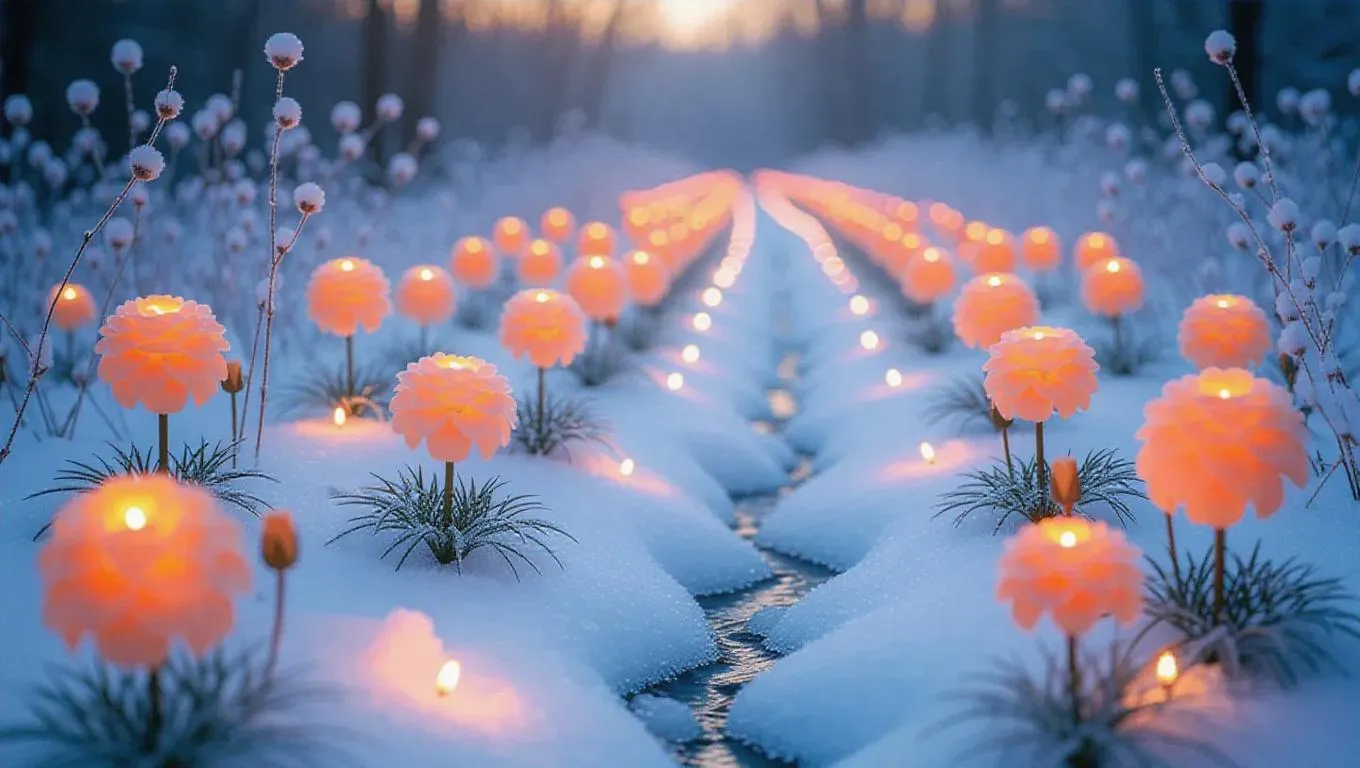 A mystical path adorned with glowing ice marigolds blooming in the snow, petals crafted from translucent frosted crystal, casting serene light and shimmering hues, creating an enchanting winter wonderland in a tranquil frosty marsh.