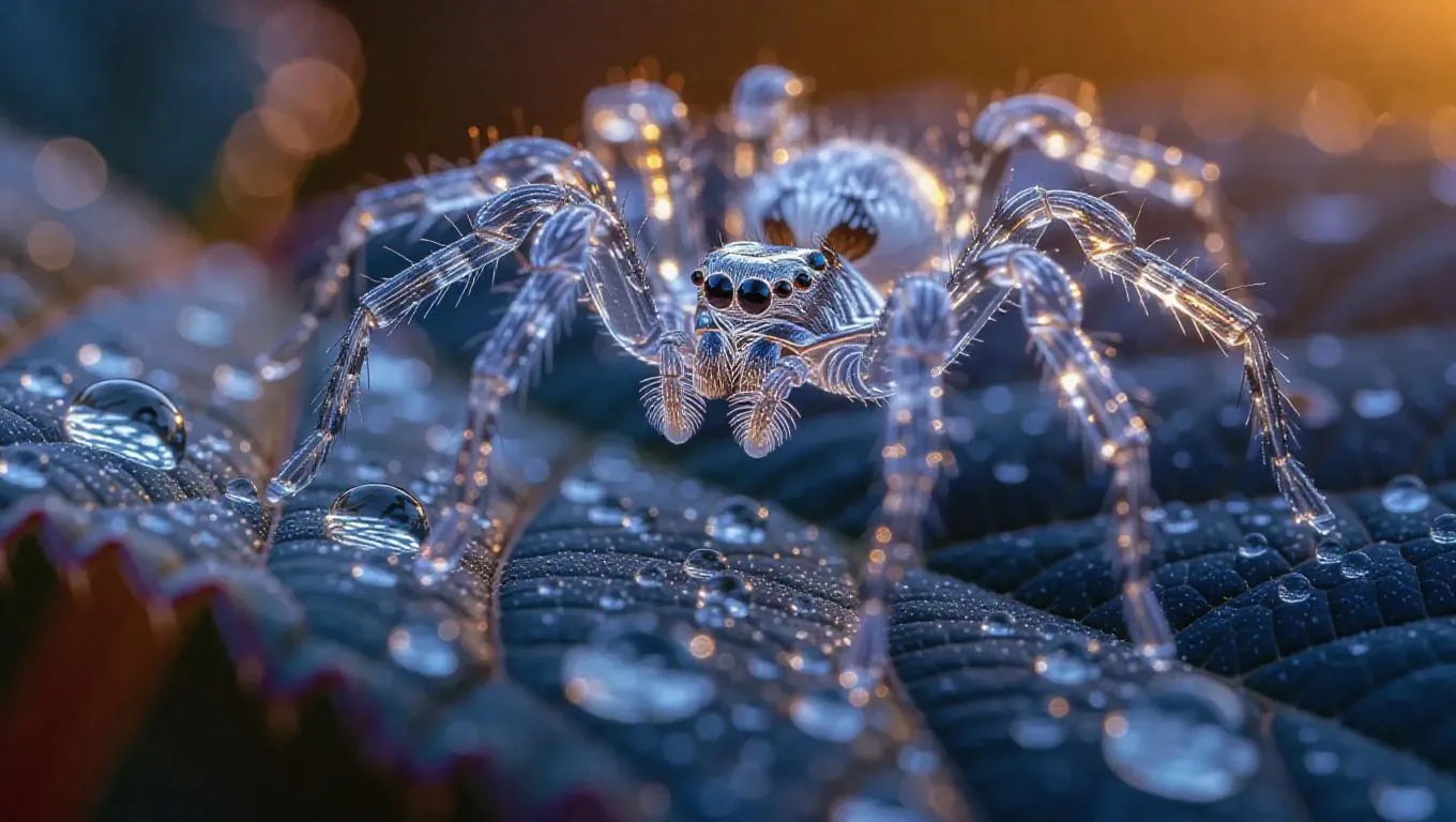 A delicate crystal spider perched on a frosted leaf, legs crafted from transparent ice with intricate, shimmering patterns, glowing softly in the gentle morning light, surrounded by dewdrops that sparkle like diamonds on a desert oasis.