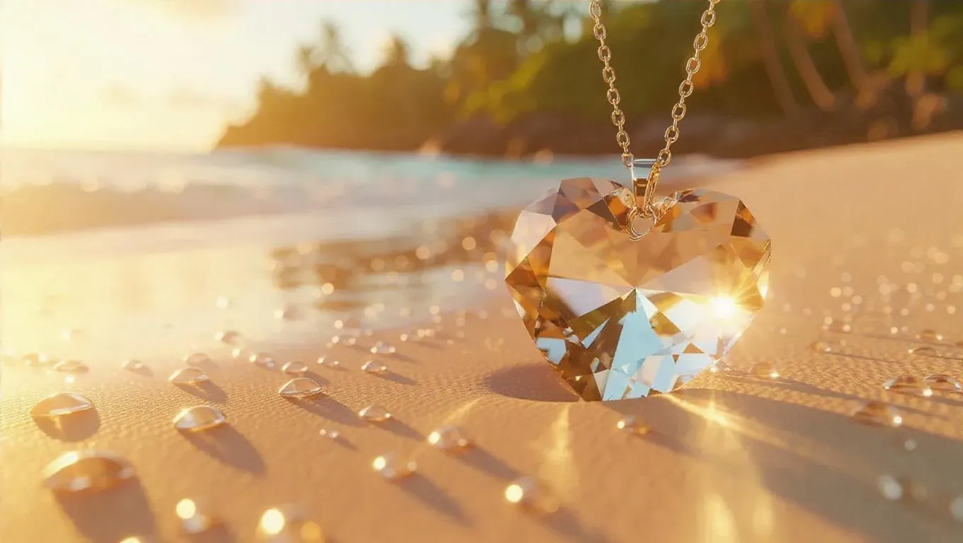 A heart-shaped crystal pendant, resting delicately on a sandy beach, glowing faintly with an ethereal inner light, casting soft, shimmering reflections on the golden surface, surrounded by a serene, tropical paradise