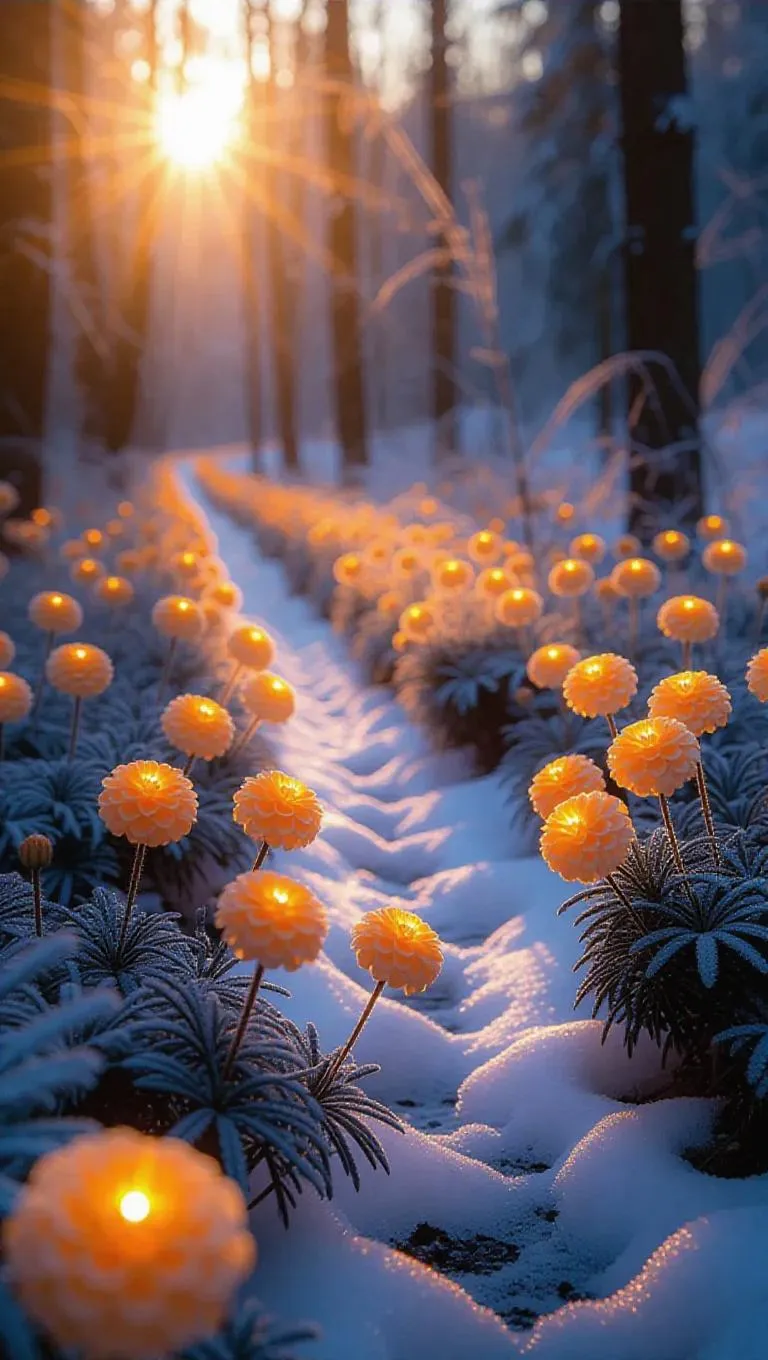 A mystical path adorned with glowing ice marigolds blooming in sunlight, petals crafted from semi-transparent frosted crystal, casting warm light and shimmering hues, creating an enchanting winter wonderland in a tranquil frosty glen.