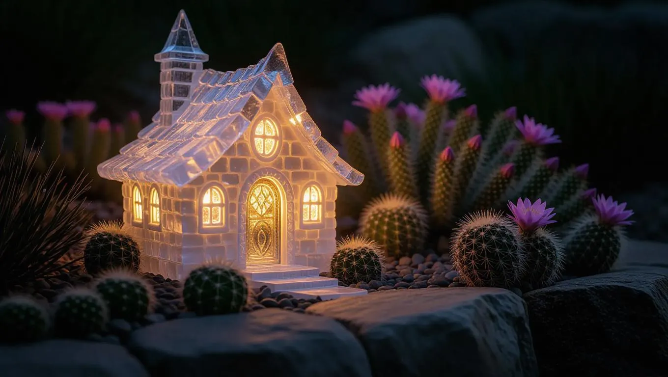 A delicate fairy house crafted from intricately carved ice, featuring glowing crystal windows that shimmer with ethereal light, nestled in a rocky outcrop, surrounded by hardy shrubs and flowering cacti