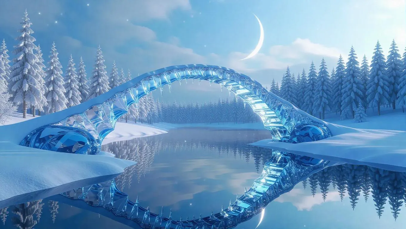 A mystical ice crystal bridge arcing over a frost-covered lake, shimmering under the bright crescent moon, with detailed frost patterns adorning the ice, creating a marvelous winter atmosphere