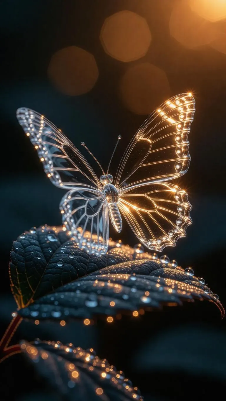 A delicate crystal butterfly perched on a frosted leaf, wings crafted from transparent glass with intricate, shimmering patterns, glowing softly in the crisp afternoon sun, surrounded by dewdrops that sparkle like morning mist.