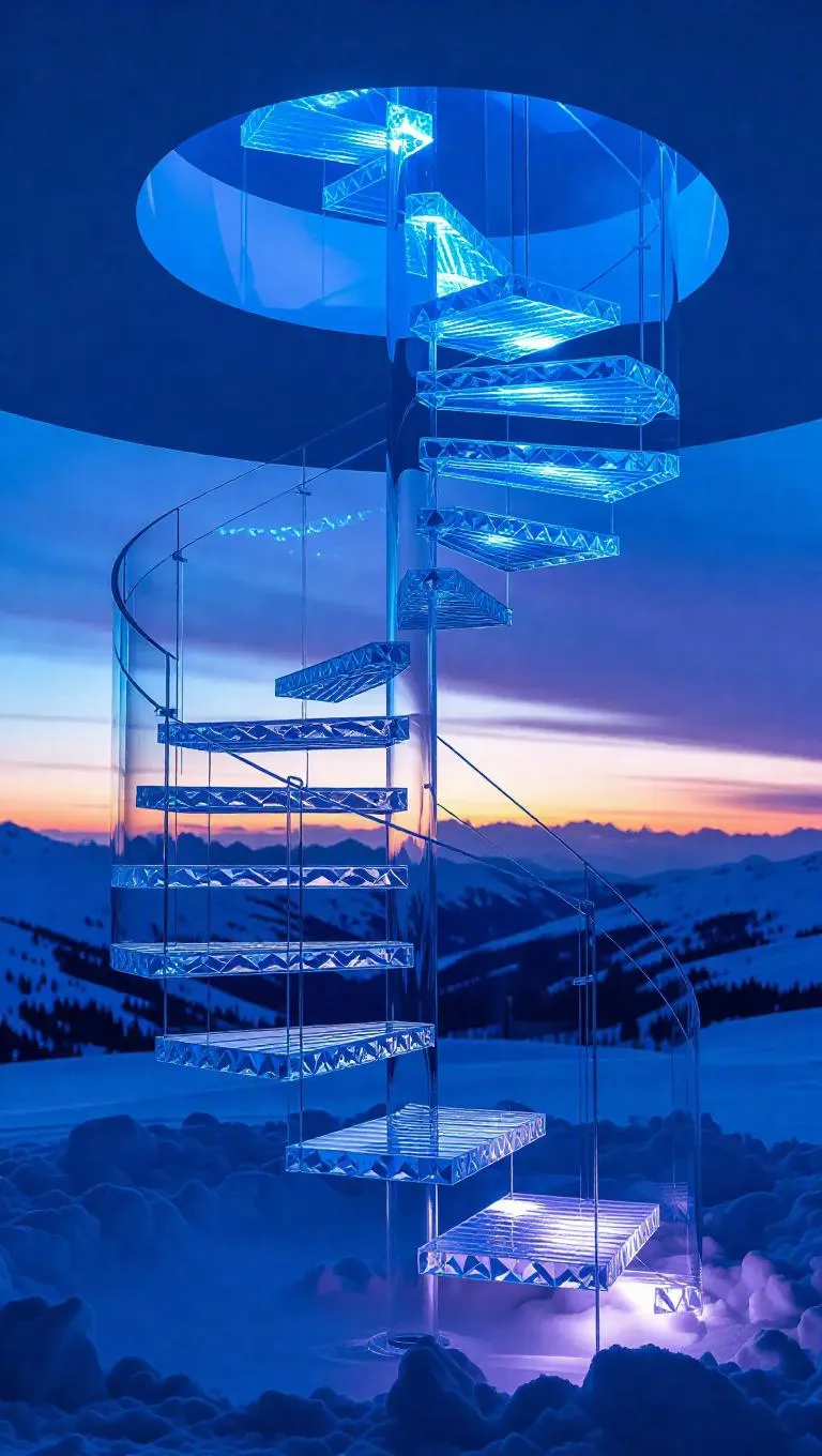 A spiraling staircase crafted from frosted glass and transparent ice crystals, ascending into a vast, snowy sky, illuminated by soft, ethereal blue light, creating a magical and otherworldly atmosphere