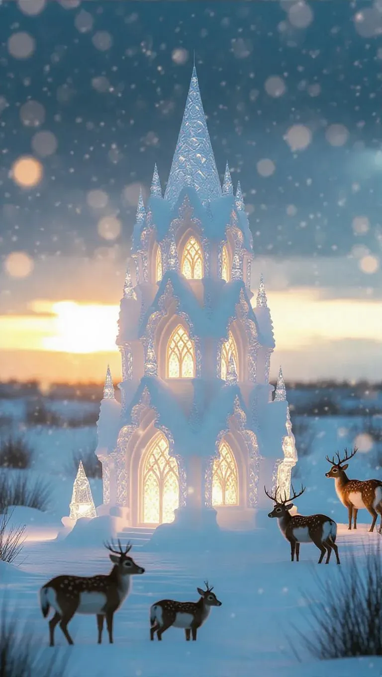 A delicate fairy tower crafted from intricately carved ice, featuring glowing crystal windows that shimmer with ethereal light, nestled in a remote tundra, surrounded by wild animals and sparkling snowflakes.
