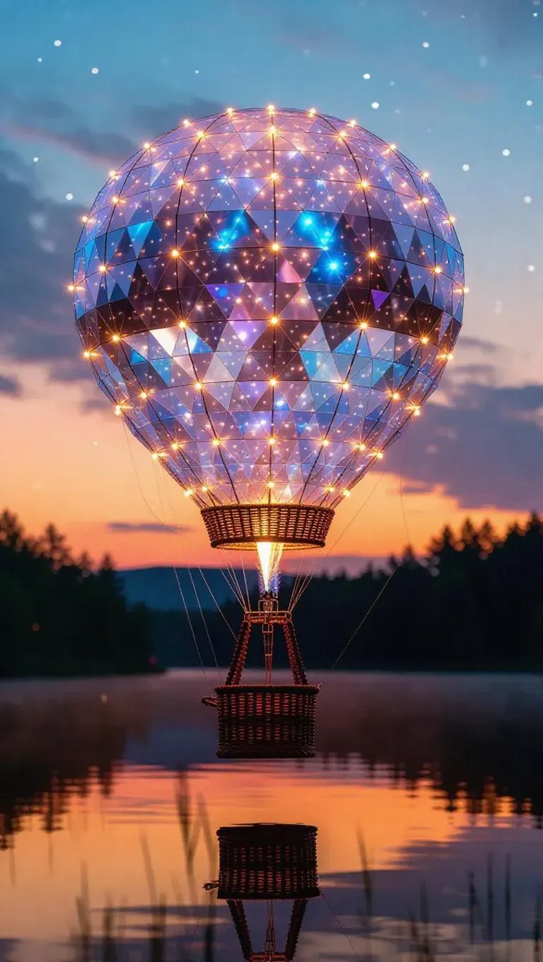 a spinning hot air balloon crafted from shimmering crystal baskets and twinkling icy lights, set against a tranquil evening sky with fading stars, evoking a sense of calm and peace, placed in a serene lake with shimmering reflections and a tender, pastel light.