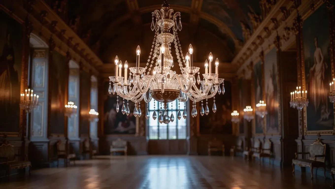 An elegant chandelier crafted entirely from shimmering ice crystals, suspended in a historic castle ballroom with tapestries and chandeliers, reflecting a mesmerizing array of light and shadows, creating an ethereal, frosty aura in the royal venue.