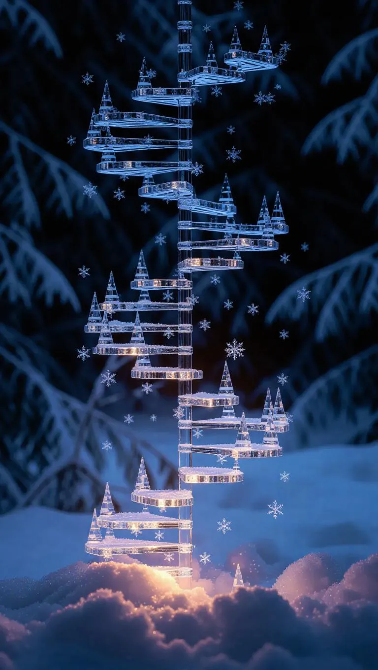 A twisting spiral staircase of frost rotates while crystallizing new frost-veined steps, each tread blooming delicate ice motifs that fluctuate with temperature. The ethereal couch exhales aurora particles, its cold glow revealing ancient snowy sagas across the tundra. Every blizzard snowflake carries miniature crystal castles, while background snowfalls hover in perpetual slow motion yet never arrive.