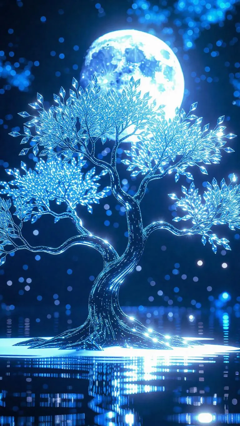 A magical tree with branches of shimmering ice and leaves of enchanted glass, sparkling and glistening under the ethereal moonlight, casting otherworldly reflections and creating a surreal, frosty atmosphere