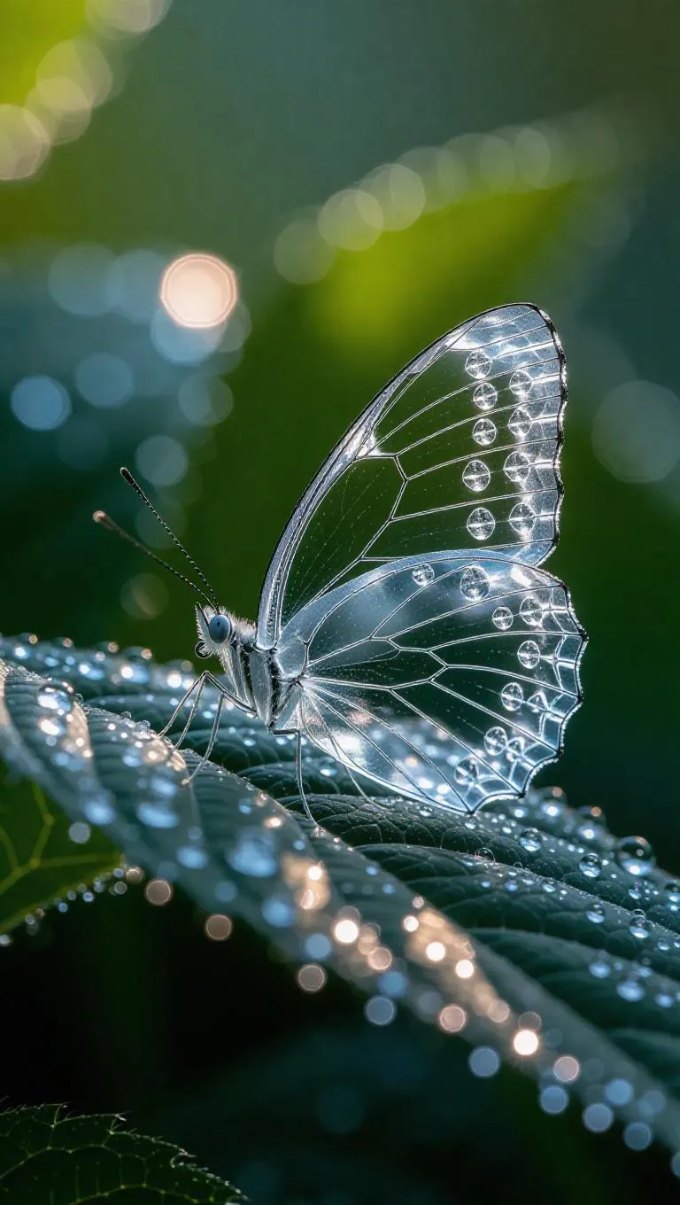 A delicate crystal butterfly resting on an emerald leaf, wings crafted from transparent ice with intricate, shimmering patterns, glowing softly in the crisp morning light, surrounded by dewdrops that sparkle like frost.