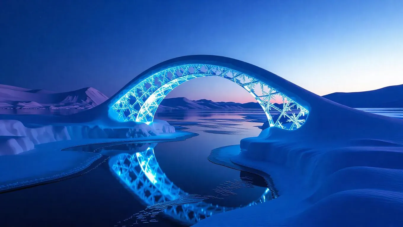 A mystical ice crystal bridge rising high over a serene frozen bay, sparkling under the evening stars, with intricate frost patterns adorning the ice, creating a magical winter landscape