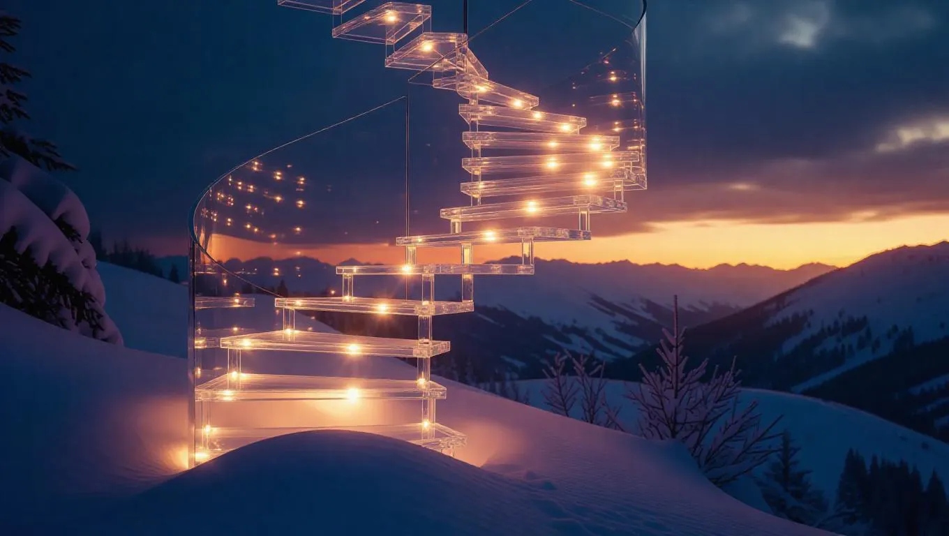 A spiraling staircase crafted from frosted glass and glowing fire crystals, ascending into a vast, snowy sky, illuminated by soft, ethereal light, creating a magical and otherworldly atmosphere