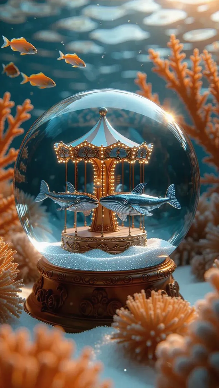 A magical snow globe encasing a spinning carousel crafted from clear glass whales and radiant sea lights, set against a coral reef backdrop with playful fish, evoking a sense of curiosity and exploration