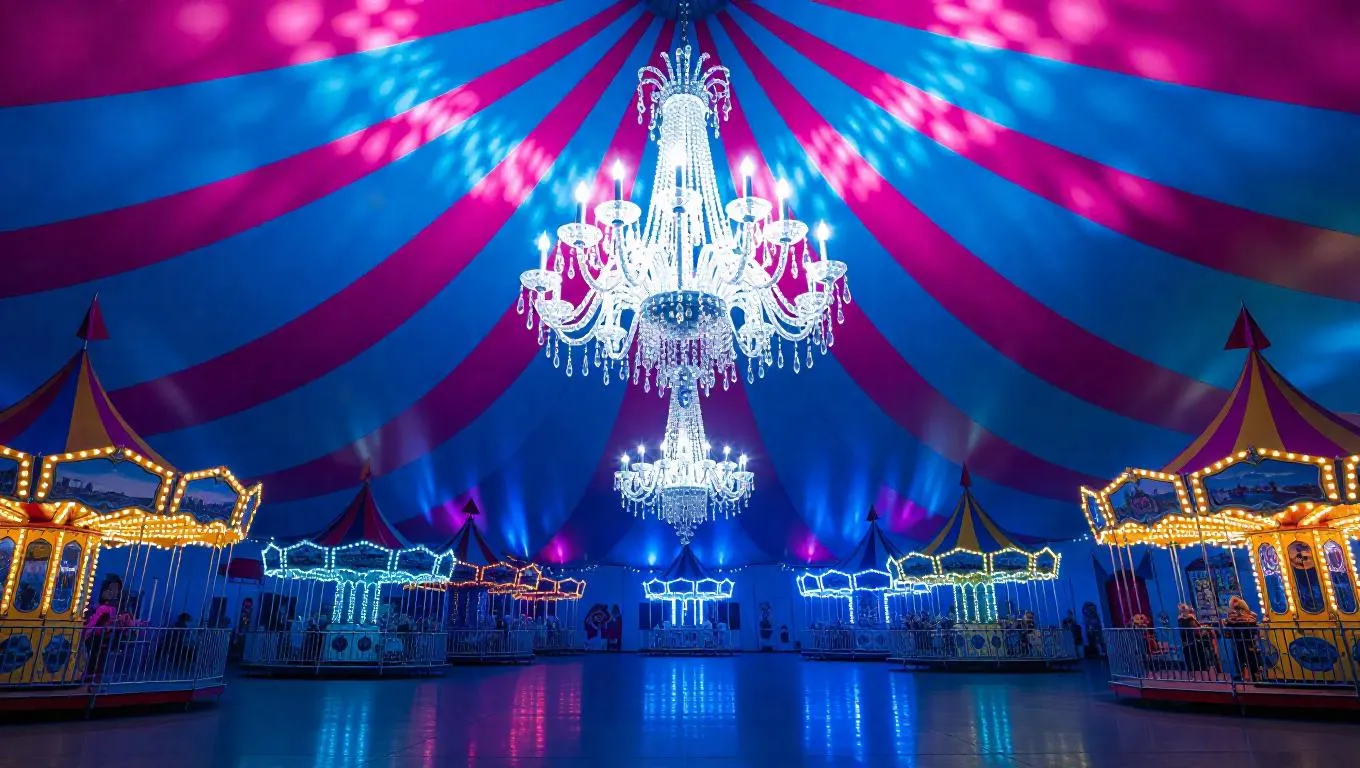 An elegant chandelier crafted entirely from shimmering ice crystals, suspended in a colorful carnival tent with fun rides and games, reflecting a mesmerizing array of light and shadows, creating an ethereal, frosty aura in the amusement space.