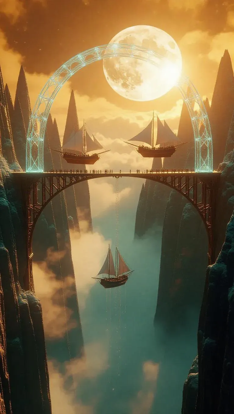An iridescent crystal arch spans a chasm of glowing fog, linking floating islands of frosted coral where airships shaped like icicles dock, their sails woven from crystalline mist, as diamond snow falls through a moon veiled in golden clouds.