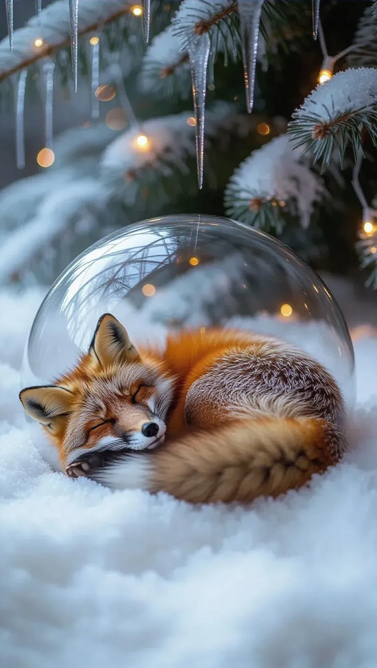A sleeping fox curled inside a translucent crystal dome, surrounded by dazzling icicles and soft, fluffy snow, creating a magical, winter wonderland atmosphere