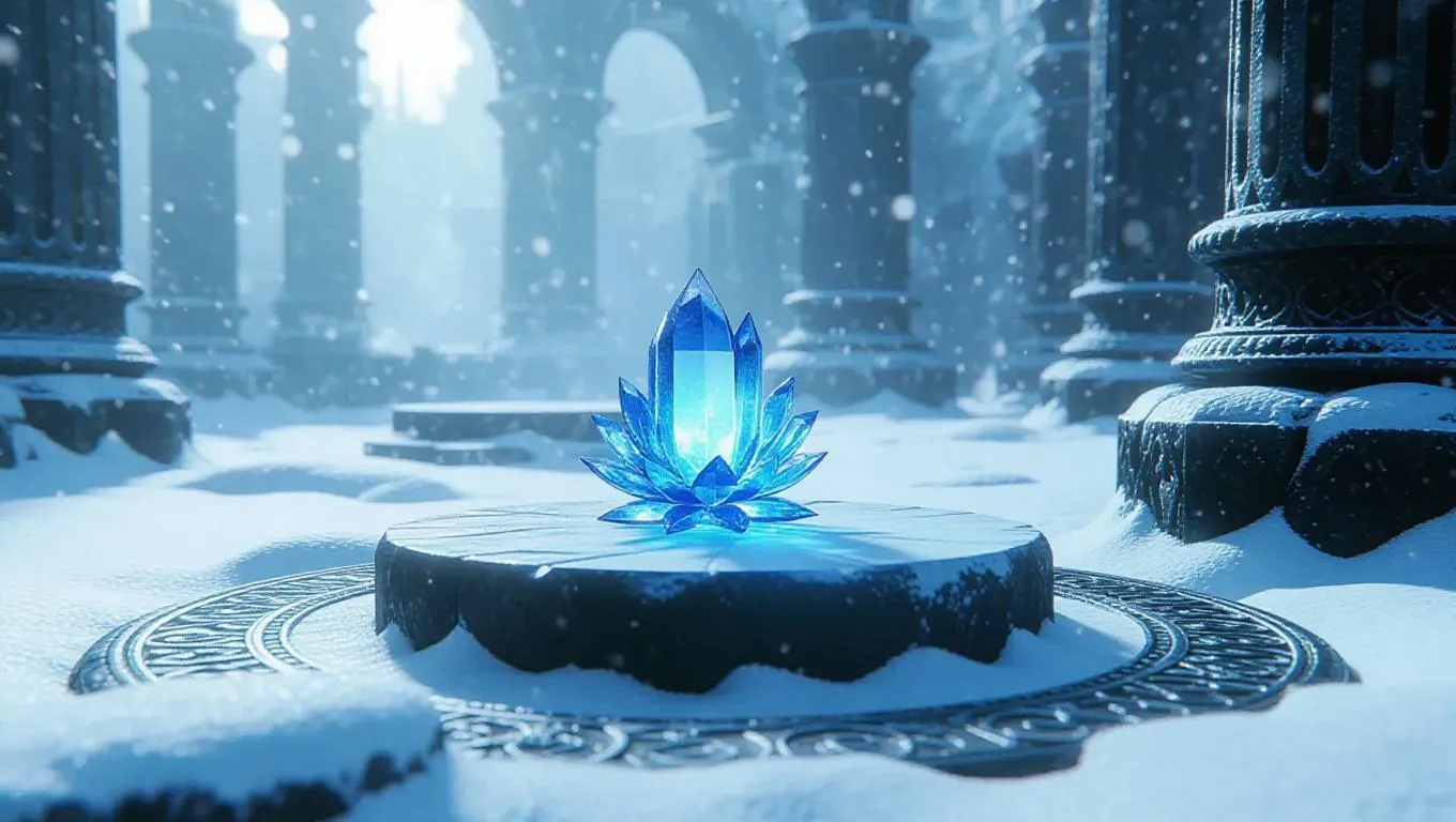 A single ethereal blue crystal flower emerging from a fissure in the icy ground, encircled by delicate, filigree snowflakes. The flower radiates a subtle glow, casting a magical aura over the frosty ruins of an ancient temple, where ancient stone pillars rise from the snow-covered floor.