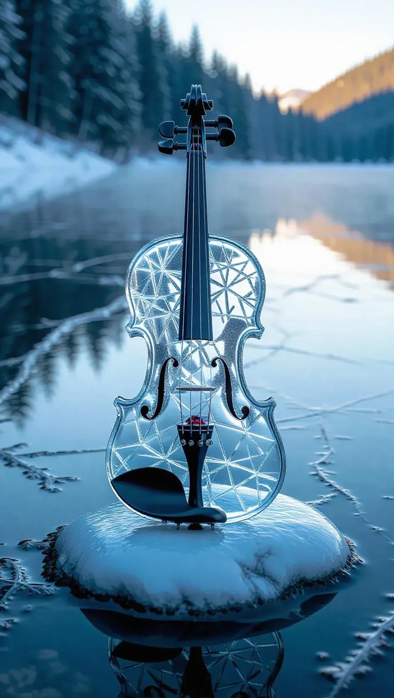A violin hewn from crystalline ice rests lightly on a smooth white pebble, its curves glinting like frozen starlight. Around it, a silent lake lies sealed in glassy ice, cracked with delicate frost patterns that spiderweb toward the shore.