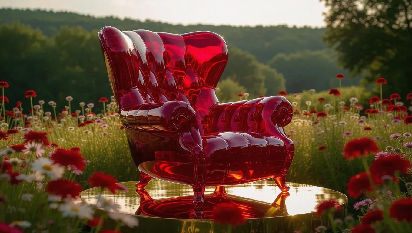 A regal armchair sculpted from radiant crimson glass, embellished with sharp ruby facets, resting on a golden dais. The glass armchair emits a fierce, fiery glow, casting dramatic shadows on the nearby flower-filled meadow.