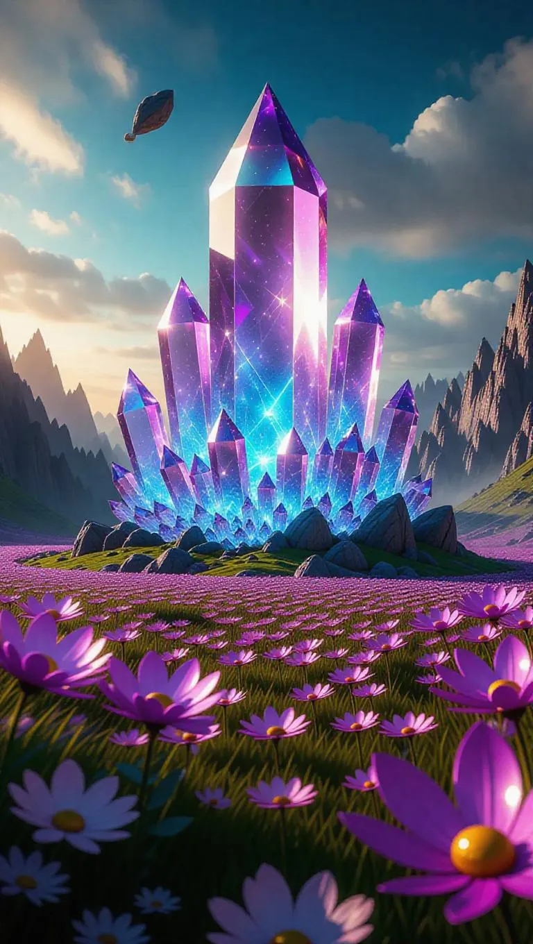 A skyline of floating quartz platforms drifts above an enormous, radiant gem meadow, where an inactive giant of crystal and stardust dozes, its scales inscribed with forgotten lore—while above, gem-blossoms sway like colorful prisms in a breeze that harmonizes through glass, creating a stunning and otherworldly scene in this mesmerizing realm.