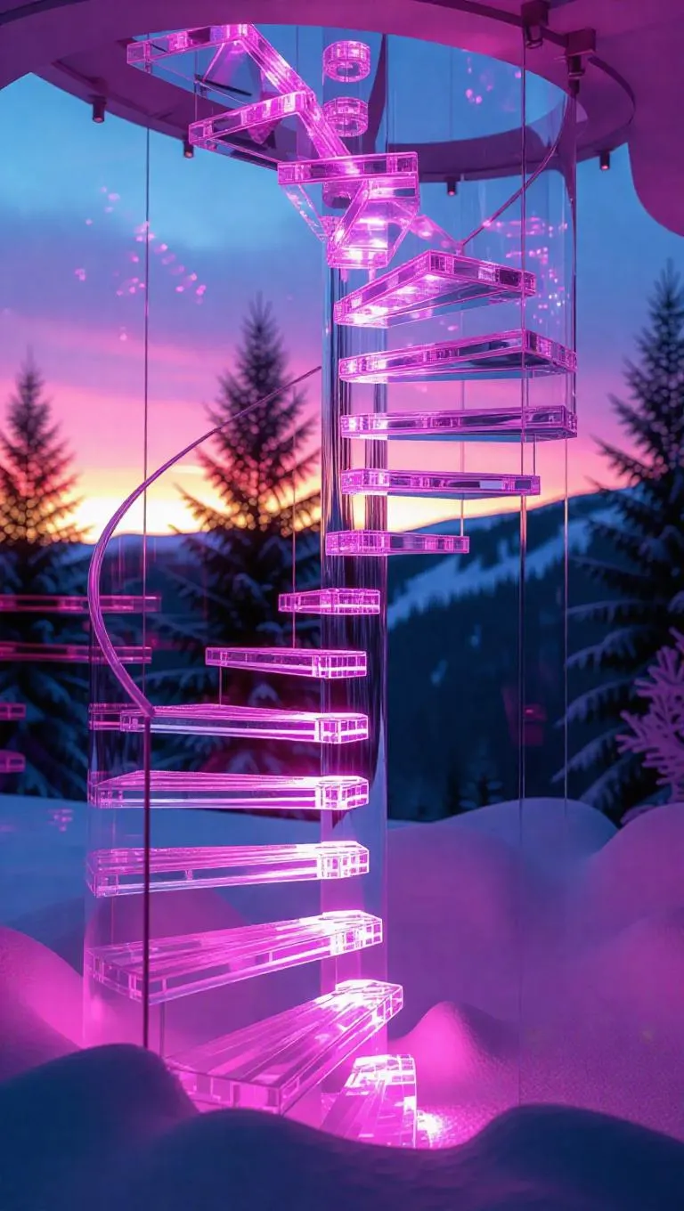 A spiraling staircase crafted from frosted glass and shimmering ice crystals, ascending into a vast, snowy dusk sky, illuminated by soft, ethereal pink light, creating a magical and otherworldly atmosphere